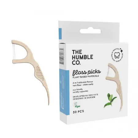 Μεσοδόντιος καθαριστής δοντιών με διπλό νήμα και ενσωματωμένη οδοντογλυφίδα από κομποστοποιημένο άμυλο καλαμποκιού. Συσκευασμένα σε φιλική προς το περιβάλλον χάρτινη συσκευασία.